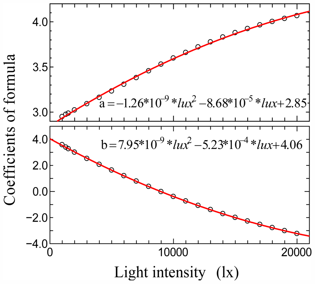The trend of the coefficients was investigated for all light intensities (Figure 2), and a generalized formula that could be applied to any light intensity was derived: