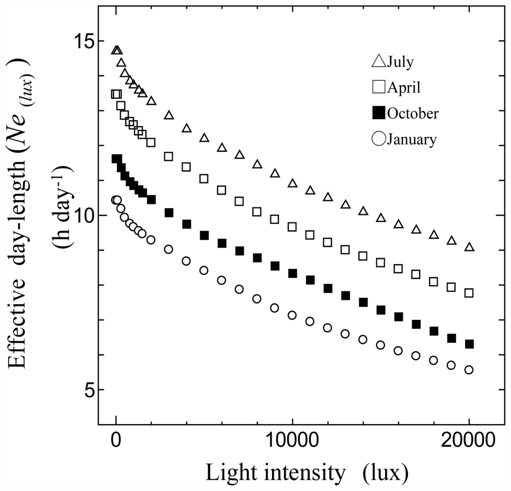 The photoperiods exceeding each defined light intensity (1 lx, 300 lx, 500 lx, 1,000 lx, …, 20,000 lx) were integrated at daily intervals. Next monthly averages of these photoperiods were calculated. In this study, this photoperiod is defined as the effective day length [Ne(lux)], where lux is the threshold of each light intensity indicated by the global horizontal illuminance.