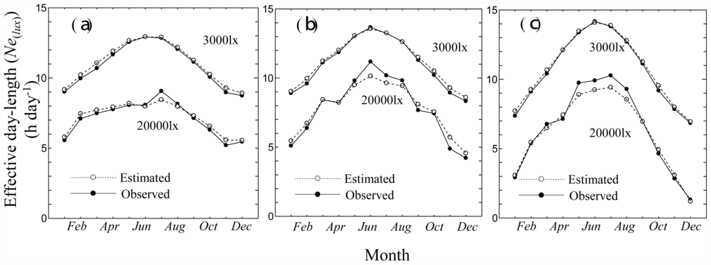 Figure 6 shows the seasonal transition of observed and estimated monthly mean effective day length [Ne(lux) h day−1] at 3,000 lx (upper) and 20,000 lx (lower) at Vaulx-en-Velin (France) station in 2008 (a), 2009 (b) and 2010 (c).