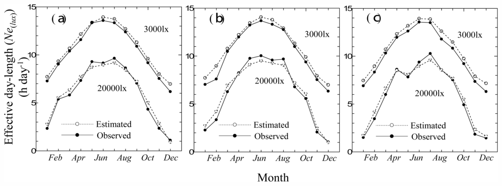 Figure 3 shows the relationships between the monthly average of the effective day length (Ne(lux)) and the light intensity at Tateno station in 2008. Because Ne(lux) varies inversely with light intensity in relation to the monthly average of N0, at low light intensity of less than 10,000 lx, the following formula can be applied: