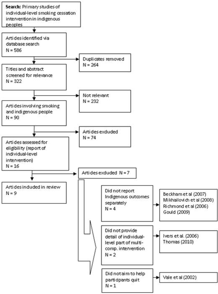 Database and hand-searching yielded 586 articles (Figure 1). Following exclusion of articles due to duplication (n = 264), 322 abstracts and titles were assessed for relevance to smoking in indigenous populations. Of the remaining 90 articles, 16 reported on primary studies of individual-level smoking cessation interventions in indigenous people. Among these, four studies were excluded because they did not report outcomes for indigenous participants separately from non-indigenous participants. Two studies of multi-component interventions were excluded because they did not report in any detail on the individual-level component of the intervention. One study was excluded because it aimed to encourage participants to reduce smoking rather than quit. The remaining nine articles were reviewed.