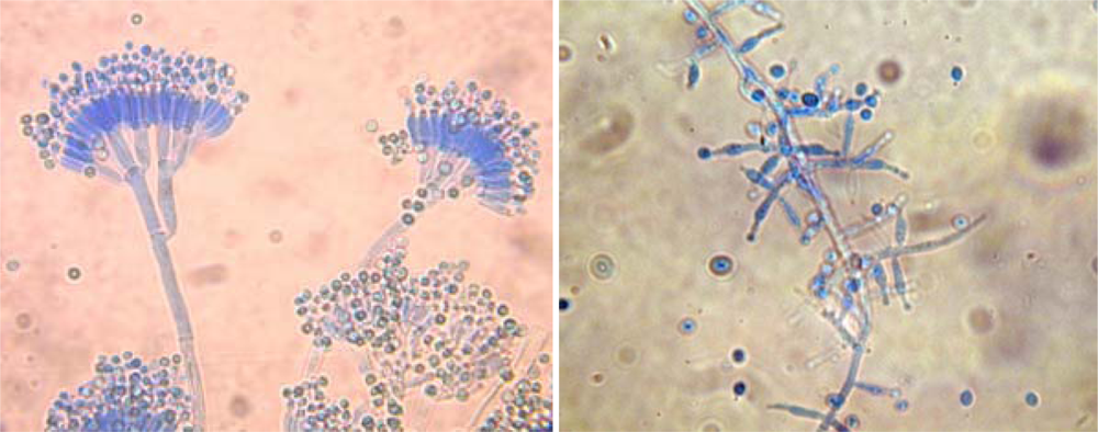 Penicillium brevicompacum (left) and Trichoderma sp. (right) isolated from tap water grown on MEA and observed under optical microscope after stained with Lactophenol Cotton Blue.