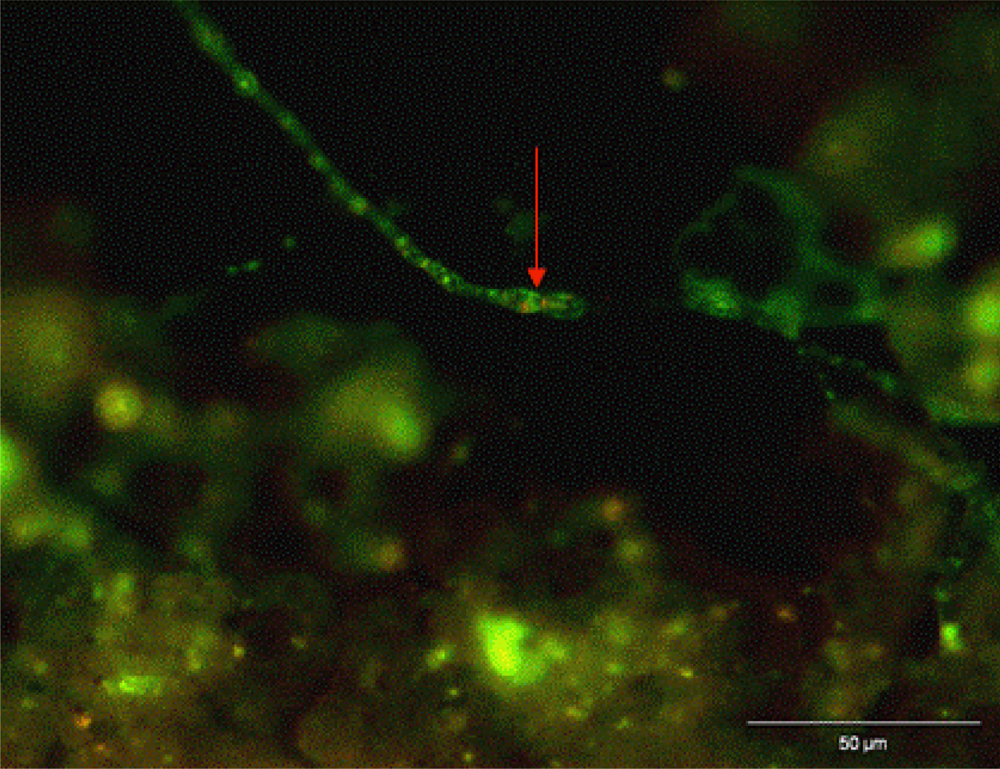 Visualization of red CIVS (arrow) and green diffuse hypha after FUN1 staining biofilm in real replaced pipe samples.