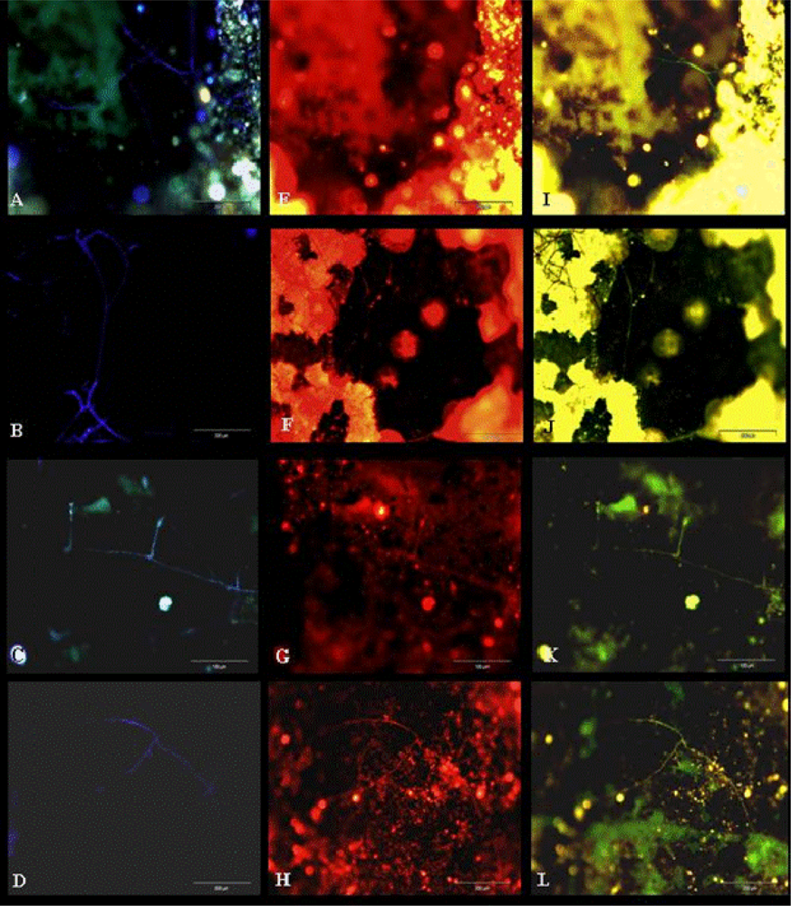 Detection of filamentous fungal water biofilm after CW staining (A-D), and analysis with FISH with EUK516 (E-H) and FUN1429 (I-L) probes in real replaced pipe samples.