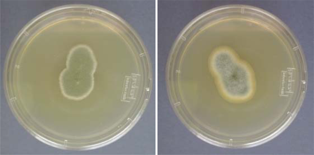 Penicillium brevicompacum (left) and Penicillium aurantiogriseum (right) isolated from tap water grown on MEA (N.B. it is significant that species names have been obtained rather than simply naming them as Penicillium spp.).