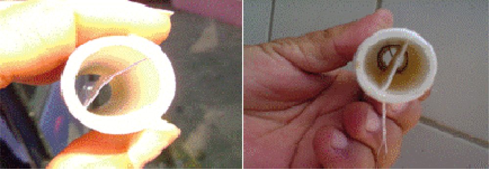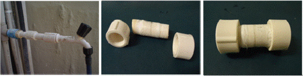 We recommend the use of “sampler devices” to investigate natural filamentous fungi biofilms which were produced for a water distribution system called “Alto do Céu” in Recife, Brazil. They were developed largely because of the limitations inherent in the alternative methods mentioned previously. The devices can be employed to: (1) mimic the real conditions of the water network and yet be straight forward to insert and handle, (2) be convenient for transportation and storage, (3) maintain the integrity of biofilms and (4) allow in situ analyses of the biofilms. The core of the sampler devices consists of hollow polyvinyl chloride (PVC) pipes within polyethylene or acetate coupons held in place to allow biofilm growth (Figure 4).