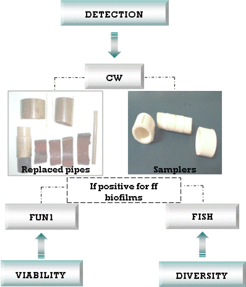 To determine total filamentous fungi, the water sample must be filtered through two 0.45 μm membranes. The membranes are to be placed on neopeptone glucose rose Bengal aureomycin agar (NGRBA) with 5 replicates for filamentous fungal isolation and colony counting. The second filter should be placed onto half strength cornmeal agar (CMA/2) with five replicates for the same purposes. The method devised by us for the analysis of fungal biofilms in Brazil is also recommended more generally. Finally, even more progress will be made only if future studies ensure that strains are identified to species and standard techniques are employed universally.