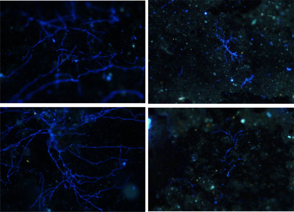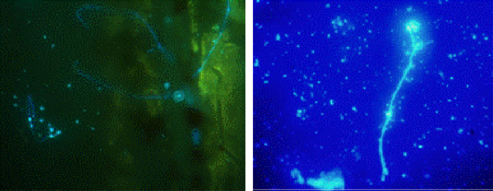 A Olympus BX51 epifluorescent microscope, using UV light equipped with 40x/0.30 and 10x/0.65 objectives and a filter set (EX 450-490 nm, EM 520), was used for detecting in situ biofilms after fluorescent staining techniques were applied. The images were acquired with a Zeiss AxioCam HRc colour camera using the software CellB®. Storage and handling of reagents were performed as recommended by the supplier. The sampler study shows presumptive filamentous fungi stained with CW colonising the polyethylene coupons after 90 days in contact with water (Figure 8).