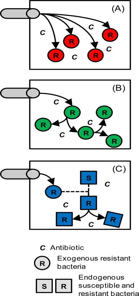 Scenarios for the presence of resistant bacteria in the environment. (A) Input of resistant bacteria from external sources is significant, but they do not grow; (B) Input of resistant bacteria is negligible, but the resistant bacteria grow due to the selection pressure of the antibiotic; (C) Exogenous bacteria transfer the resistance to the endogenous bacteria and those grow.