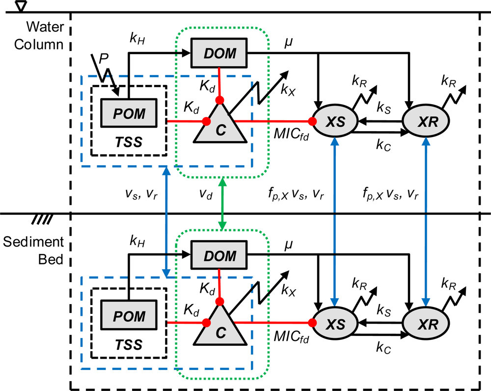 Schematic of model state variables and processes. The model includes five state variables in the water column and sediment bed: C = tetracycline, XS = susceptible bacteria, XR = resistant bacteria, POM = particulate organic matter, DOM = dissolved organic matter. The model includes a number of mechanisms: kX = decay, Kd = partitioning, TSS = total suspended solids, μ = growth, kR = respiration, kC resistance transfer, kS = resistance loss, MICfd = tetracycline toxicity, P = POM production, kH POM hydrolysis, vs = settling, vr = resuspension, vd = diffusion, fp,X = particle-associated bacteria.