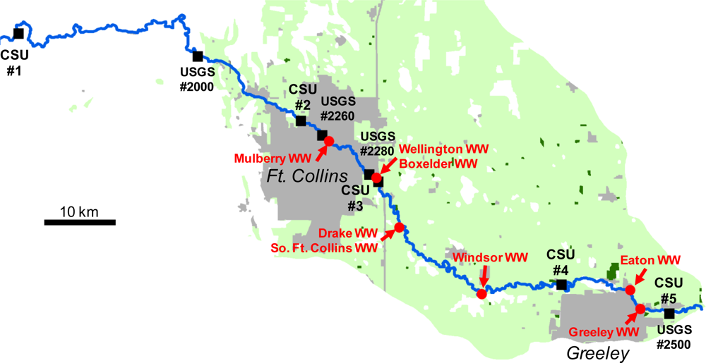 The (Cache la) Poudre River in Colorado is a testbed for studying antibiotic fate and transport and antibiotic resistance in the aquatic environment (Figure 3). The watershed is a relatively complex system, including numerous discharges, withdrawals, tributaries, etc. Effluent from several municipal wastewater treatment plants (WWTPs) enters at various points along the river (Figure 3, red arrows). The upstream area (above USGS#2000) is mostly pristine forest. Downstream are the Ft. Collins and Greeley urban centers (gray areas), and the surrounding land use is agricultural, with mostly cropland and pasture (AG, light green) and confined animal feeding operations (CAFO, dark green).