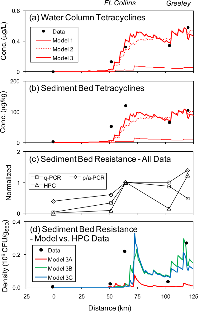 (a) Water column; (b) sediment bed tetracycline concentrations in the Poudre River; (c–d) Sediment bed tetracycline resistance.Note: In (a) and (b), Water column concentrations are dissolved. Symbols are data from Yang and Carlson [37], and Kim and Carlson [36,40]. Lines are model predictions. Model 1 includes tetracycline input from wastewater treatment plants (WWTPs) only. Model 2 includes tetracycline input from WWTPs and agriculture. Model 3 includes tetracycline input from WWTPs and agricultural, and decay. (c) Data from Pruden et al. [4] and Pei et al. [41] normalized to CSU#3 (Colorado State University Station 3) (65 km). Data are: HPC (heterotrophic plate count): mean CFUr/gSED (CFU = colony forming unit) for CTC (chlortetracycline), OTC (oxytetracycline) and MCC (meclocycline), p/a-PCR (presence/absence polymerase chain reaction): resistance genes frequency of detection, q-PCR (quantitative polymerase chain reaction): (tet(W) + tet(O))/16S rRNA (ribosomal RNA) gene copies. (d) Model-data comparison. Symbols are HPC data from Pei et al. [41]. Lines are model predictions. All three models are based on Model 3 (tetracycline input from WWTPs and agriculture, and decay) exploring three different scenarios for the presence of resistant bacteria in the Poudre River. Model 3A includes significant external input of resistant bacteria, but no growth. Model 3B includes negligible input of resistant bacteria, but the resistant bacteria grow due to the selection pressure of the antibiotic. Model 3C includes transfer of the resistance from the exogenous bacteria to the endogenous bacteria, and those grow. Distance is downstream from CSU#1 (see Figure 3).