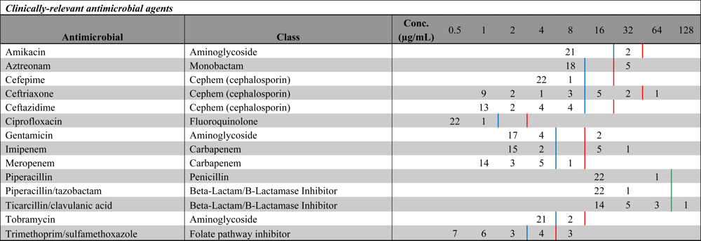 All 23 isolates analyzed were resistant to at least one antimicrobial, and several were multidrug-resistant. Of the clinically relevant antibiotics included in the screening panel, there was resistance to amikacin (intermediate, 9%), aztreonam (22%), ceftriaxone (4% resistant, 30% intermediate), gentamicin (9%), imipenem (26%), meropenem (intermediate, 4%), ticarcillin/clavulanic acid (4%), tobramycin (intermediate, 9%), and trimethoprim/sulfamethoxazole (13% resistant, 17% intermediate). Table 2 shows minimum inhibitory concentrations (MIC) to these antibiotics. High levels of resistance were noted to eight additional antibiotics (e.g., ampicillin, nitrofurantoin, etc.; See Table 3), but these were not included in the MIC analysis as they are not clinically indicated for the treatment Pseudomonas aeruginosa infections. Resistance is defined as an MIC result above the susceptibility upper bound, and intermediate resistance is defined as an MIC result above the susceptibility lower bound, but below the susceptibility upper bound.