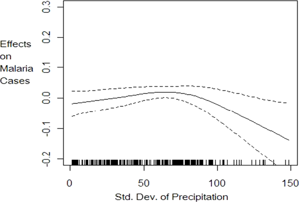 Effect of climate variability (standard deviation of precipitation) on per capita malaria cases with 95% confidence intervals. This graph is the plot of the function θ0(STDPRECIPit) in Equation (8). It describes the impact of climate variability measured as the standard deviation of precipitation on malaria prevalence.
