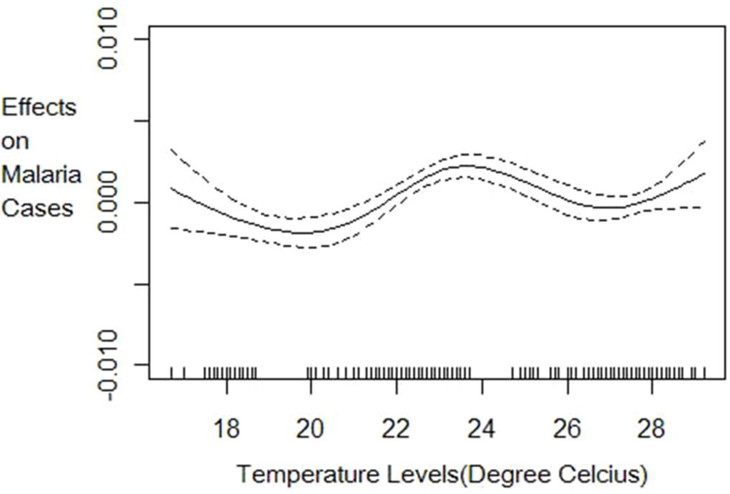 Recent studies have attempted to estimate the impact of climate change on malaria prevalence. Ebi et al. [22] studied climate suitability for stable malaria transmission in Zimbabwe under various climate change scenarios based on MARA/ARMA (Mapping Malaria Risk in Africa/Atlas du Risque de la Malaria en Afrique) decision rules. They indicate that changes in temperature and precipitation could alter the geographic distribution of malaria in Zimbabwe, with previously unsuitable regions with dense human populations becoming suitable. Thomson et al. [23] investigated the effect of rainfall and sea surface temperature on malaria incidence in Botswana finding that variability in rainfall and sea temperature accounts for more than two-thirds of the inter-annual variability in malaria incidence. Ndiaye et al. [24] studied relationships between climate variability and malaria mortality in a small region of Senegal from 1984 to 1996. They found that 89.1% of the malaria mortality was observed in August and December which are relatively rainy and warmer months. They found high correlation between rainfall variability and malaria mortality but did not find significant correlation with temperature and humidity variability. Jaenisch and Patz [25] find that malaria prevalence is sensitive to short-term fluctuations in temperature and rainfalls in a way that extreme precipitation events could wash away anopheles mosquito larvae from breeding sites and lead to reduced incidence. This argument means that the relationship between malaria cases and climatic factors is of a nonlinear nature and using linear functions to study such relationship will be misleading. Wandiga et al. [8] found significant correlation between malaria cases and climatic factors in Uganda but implicitly assumed a linear relationship [25]. Zhou et al. [7] pursued a nonlinear relationship study and found that climatic factors were the driving forces behind malaria’s resurgence in highlands of Africa explaining 65 to 81 percent of the variation in number of cases. They also found a statistically significant synergy effect between temperature and precipitation in determining the number of malaria cases in all the regions studied.