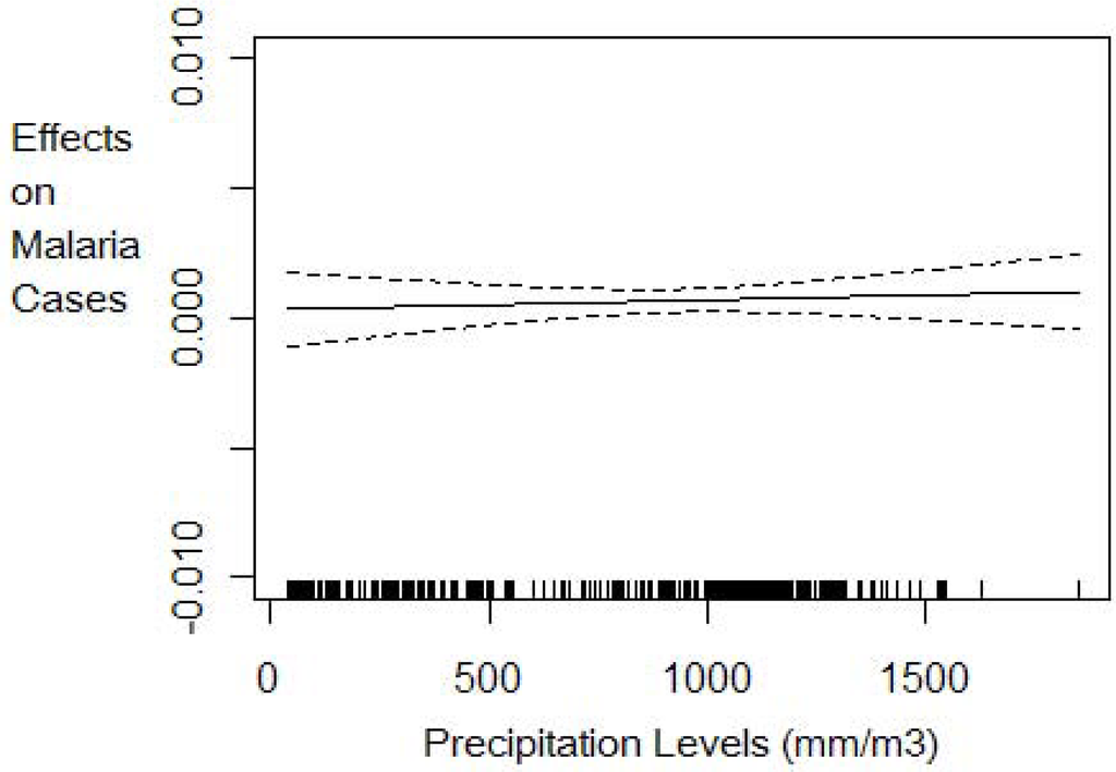 Two specifications of the nonlinear function f are assumed and estimated. The first assumes an additive form and the second, a complex function of unknown form of f. In the first specification, the function f is smooth in the climate variability index measured by monthly standard deviation in precipitation. In such case, climate variability affects the number of malaria cases not only through the intercept (θ0) but also through the slope of temperature (θ1) and precipitation (θ2). That is, the effect of temperature and precipitation on the number of cases will depend on how precipitation variability evolves (consistent with the argument made by Jaenisch and Patz [25]). In other words, the size of the impact of temperature and precipitation on the malaria prevalence is conditioned by fluctuations in climate measured by the standard deviation in precipitation. The empirical statistical relationship between malaria cases, climatic and socio-economic variables can be written as: