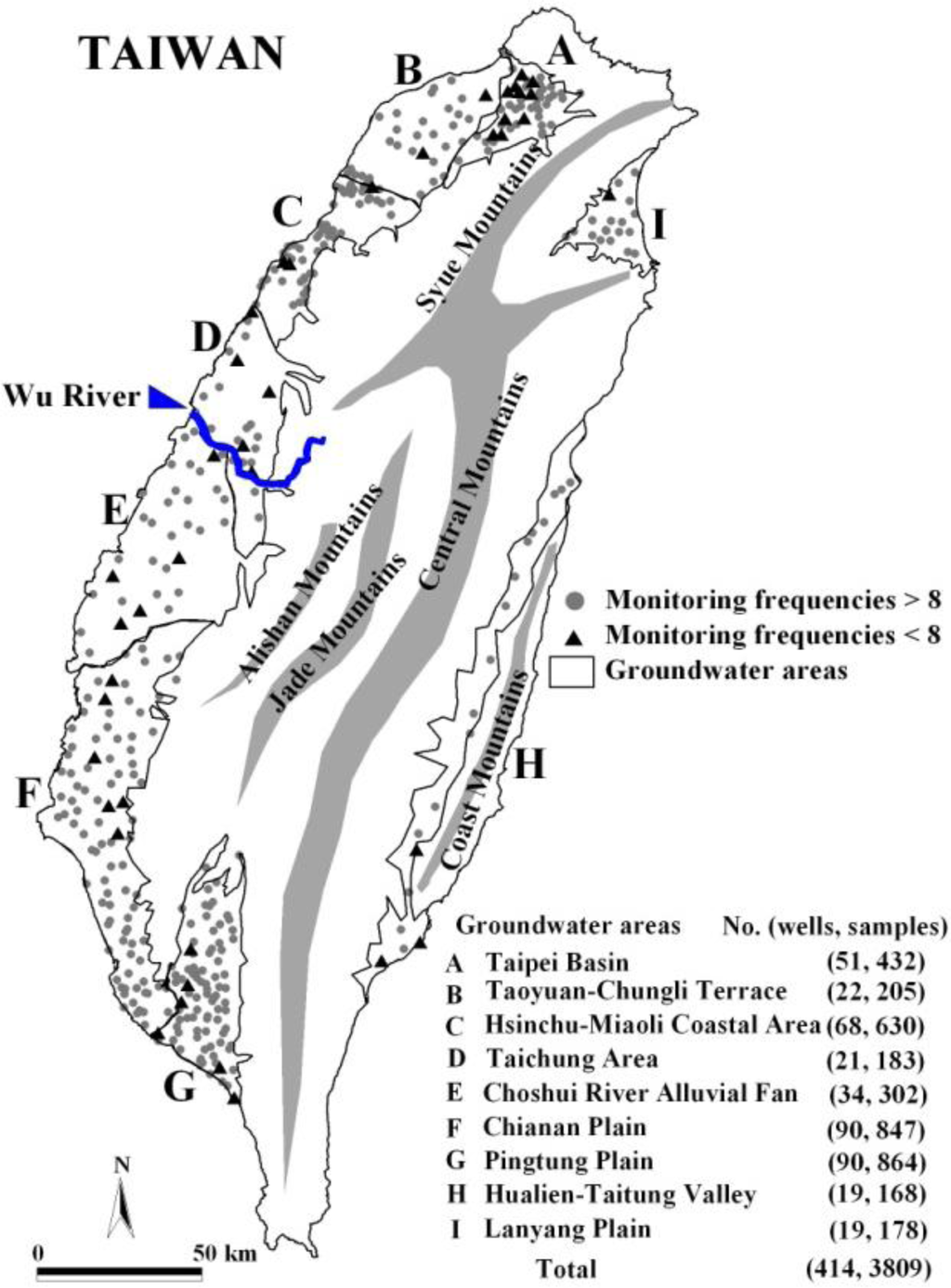 Taiwan is approximately 36,000 square kilometers is extension, with 32% of the whole island having mean sea level elevations higher than 1,000 meters. The average annual precipitation is about 2,150 mm; the majority of this precipitation occurs from typhoons during the wet season from May to October. However, the spatial and temporal distributions of precipitation are extremely uneven, leading to a great difference in river flow during the dry and wet season. In Taiwan, the groundwater aquifer belongs mostly to quaternary sediments. Geologically, the groundwater aquifer of Taiwan is made up of coastal terrace, river terrace, and alluvial plain; the plain areas are mostly alluvial fans with abundant groundwater. The distribution of groundwater resources in Taiwan are divided into nine groundwater areas. The water resources come from surface water (68%) and groundwater (32%) to supply 70% of agricultural, 21% of domestic, and 9% of industrial water demands [27]. The stable quantity of groundwater deems it an important water resource.