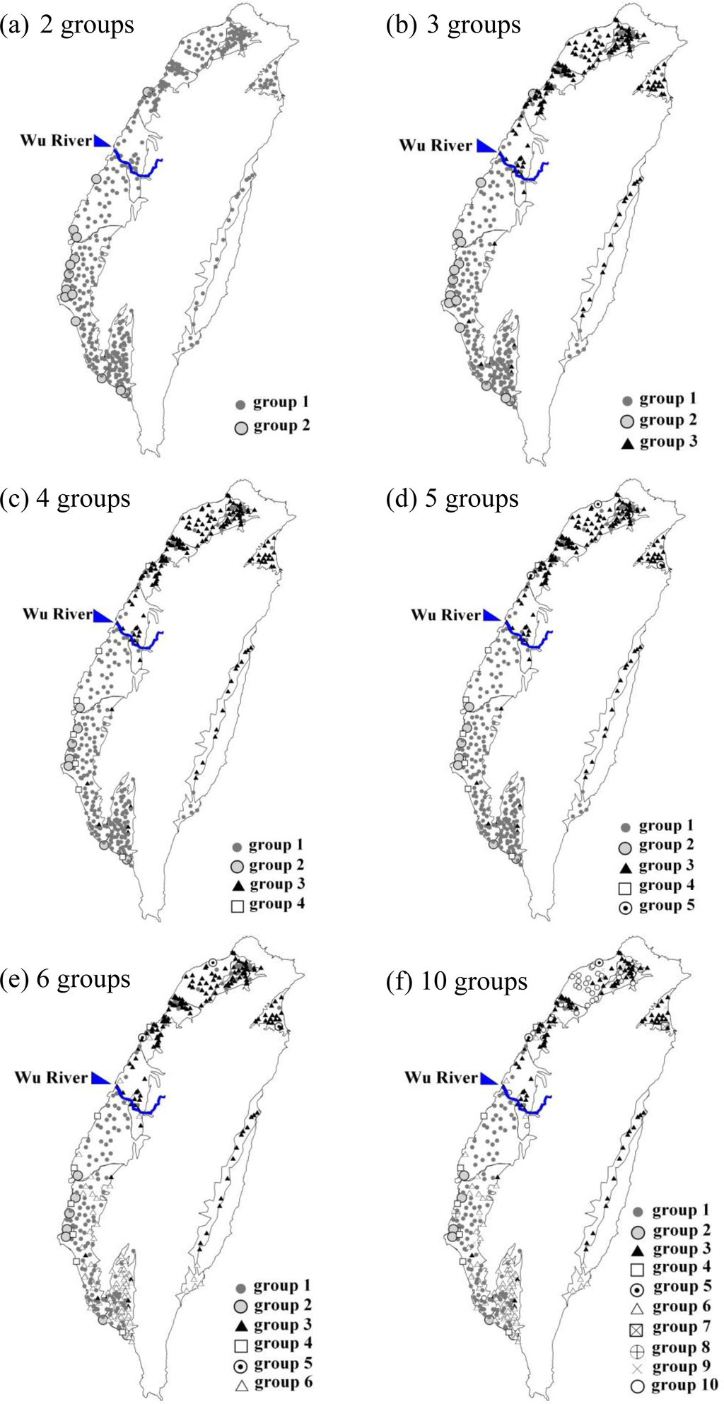 When the monitoring wells were divided into two groups, the percentages of monitoring wells in the groups were 96% and 4%. Monitoring wells of the smaller group located in Southwestern Taiwan had the spatial aggregation as shown in Figure 2(a). When divided into three groups [ (Dlink / Dmax ) × 100 <10, Dlink / Dmax represents the quotient between the linkage distances for a particular case divided by the maximal linkage distance], the percentages of monitoring wells in each group were 56%, 40% and 4%. Figure 2(b) shows the first group aggregated south of the Choshui River Alluvial Fan, the second group in the Southwestern Taiwan, and the third group in the northern Taichung groundwater area and the eastern groundwater area. The three groups demonstrate distinct distributions in space. When the monitoring wells were divided into four and five groups, the spatial patterns were similar to those for the three previous groups, and only a few monitoring wells were divided into other groups [Figure 2(c) and 2(d)]. However, regardless of how the group increased the number of groups, as shown in Figure 2(e) and Figure 2(f), the division of groundwater characteristics into north and south groups is obvious. Therefore, in order to focus, choose to use the most appropriate area to be discussed.