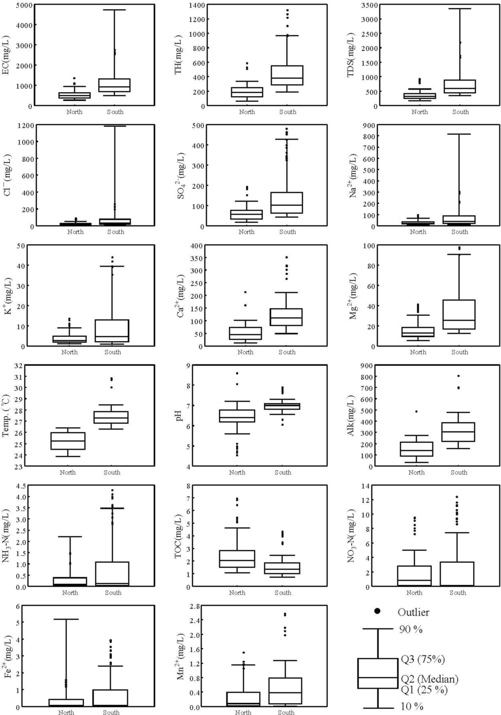 The box-and-whisker plot of various hydrochemical parameters for the northern and southern areas in Taiwan.