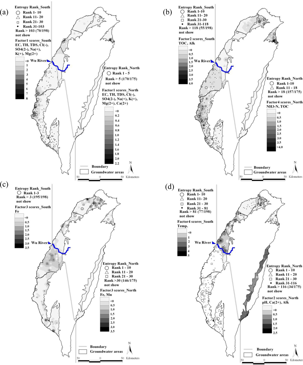Figure 4(a) shows the overlaying map of the distribution of Factor 1 scores and the ranks of information entropy values for the northern and the southern areas. For the northern area, the ranks of information entropy values for only five of the monitoring wells vary noticeably. Unstable monitoring wells occupy 2.9% (5/175) of the total number of monitoring wells, located in Taipei City, Miaoli County, and Yilan County. The regions with high scores of Factor 1 conformed to the locations of these five unstable monitoring wells. In the southern area, the ranks of information entropy values showed that 103 monitoring wells had noticeable variation with 52.0% (103/198) of the monitoring wells being unstable. The overlay map reveals that the regions with high Factor 1 scores corresponded with monitoring well locations having the upper rankings of information entropy values. A higher concentration of the groundwater quality parameter contained in Factor 1 less stability. This is common to both the southern and the northern areas, but the problem is more serious in the southwestern coast of Taiwan because Factor 1 represents the extent of groundwater salinization. Thus, the information is useful to obtain the spatial distribution of groundwater salinization. Figure 4(a) reveals that the monitoring wells that have unstable groundwater quality located in potential areas of groundwater salinization are polluted.