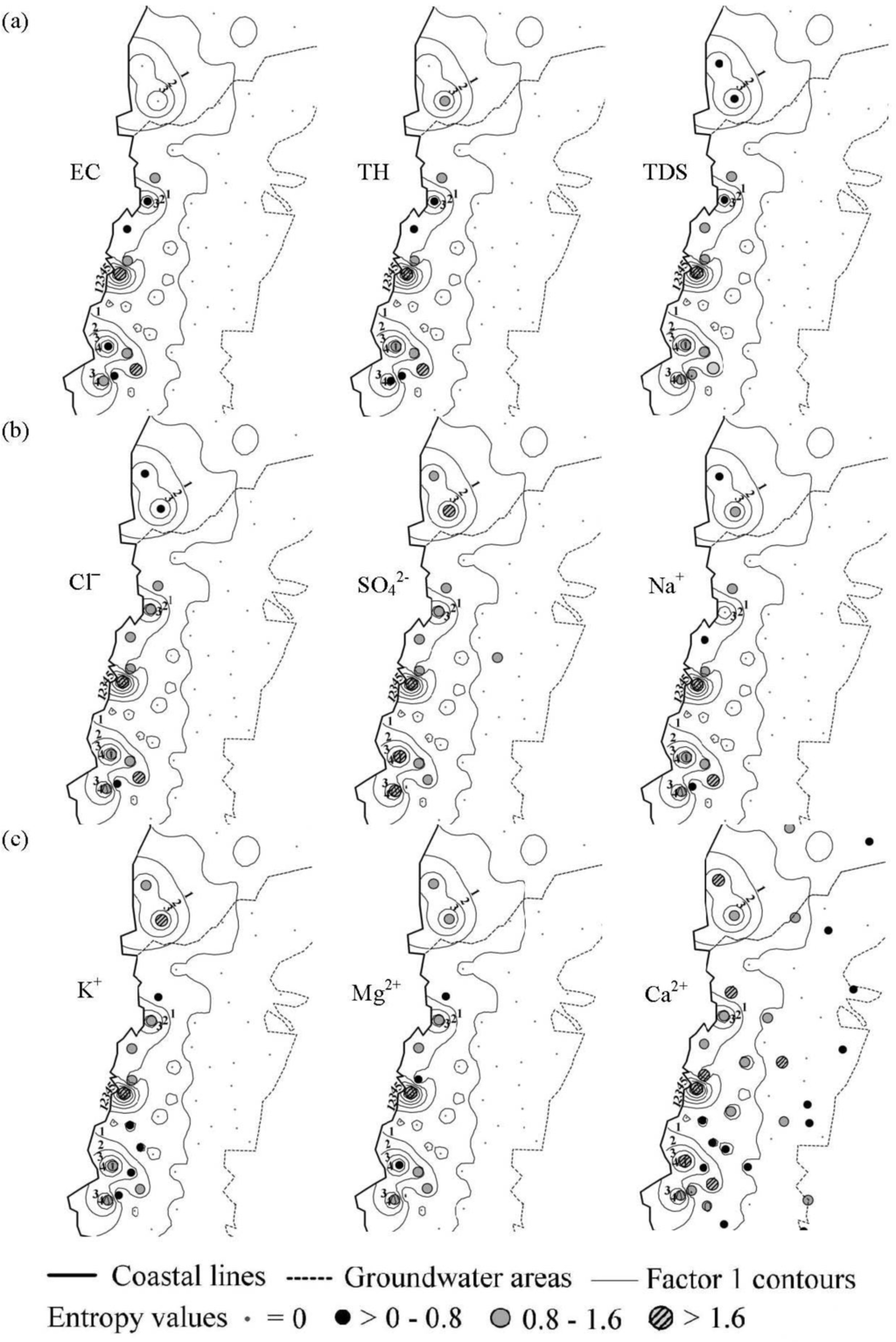To understand the extent of Factor 1 impact on groundwater quality in the southern area, the study area concentrated on monitoring wells located only in the coast area of Chianan Plain. Using the information entropy method to evaluate the stability of groundwater parameters in Factor 1 emphasized the correlation between factor scores and information entropy values as shown in Figures 5(a)–(c). Results of overlaying the contours of Factor 1 and the information entropy values of Factor 1 showed that all of the parameters except Ca2+ indicated that the monitoring wells with high information entropy values of parameters were located closely in the regions having high Factor 1 scores. This indicated that monitoring wells with high Factor 1 scores had relative poor groundwater quality stability. These monitoring wells aggregated in the coastal areas, so salinization obviously affected groundwater quality. Factor loading for Ca2+ was 0.729, lower than other parameters of Factor 1. However, Ca2+ fitted the criterion for selecting groundwater parameters, showing that Ca2+ is not a main control parameter in Factor 1. This finding could prove that additional analyses of groundwater quality uncertainty in this study assisted in understanding various groundwater parameters, and how the same pollution source affected those parameters.