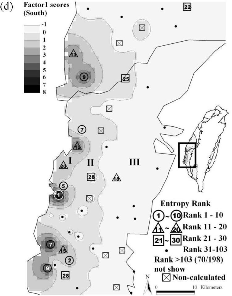 Figure 4(c) shows the overlay map of the distribution of Factor 3 scores and the ranks of information entropy values for the northern and the southern areas. The ranks of information entropy values for the northern area show that 30 monitoring wells have obvious variations with 17.1% (30/175) unstable monitoring wells, located in Taipei City, Taipei County, Taoyuan County, Hsinchu County, and Miaoli County. The regions with high Factor 3 scores conformed to monitoring well locations having upper rankings of information entropy values. In the southern area, the ranks of information entropy values revealed that three monitoring wells have obvious variations with 1.5% (3/198) unstable monitoring wells located in Tainan County, Kaohsiung County, and Pingtung County. The overlay map revealed that the regions with high Factor 3 scores corresponded with monitoring well locations having upper rankings of information entropy values. Factor 3 is composed of iron and manganese ions in the northern area, while Factor 3 only contains iron ions in the southern area. These elements are natural components of soil and rocks commonly found in groundwater, indicating that natural variation is the main cause of unstable groundwater quality.