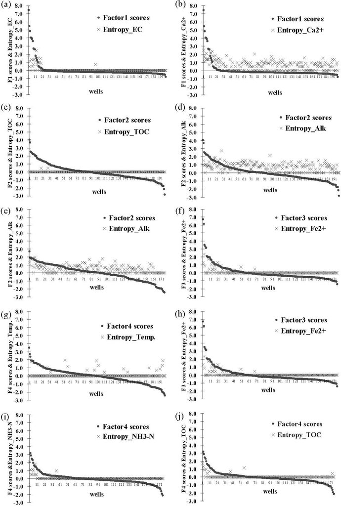 Relations between the factor score and information entropy value (a) South-EC, (b) South-Ca2+, (c) South-TOC, (d) South-Alk, (e) North-Alk, (f) South-Fe2+, (g) South-Temp., (h) North-Fe2+, (i) North-NH3-N, (j) North-TOC.