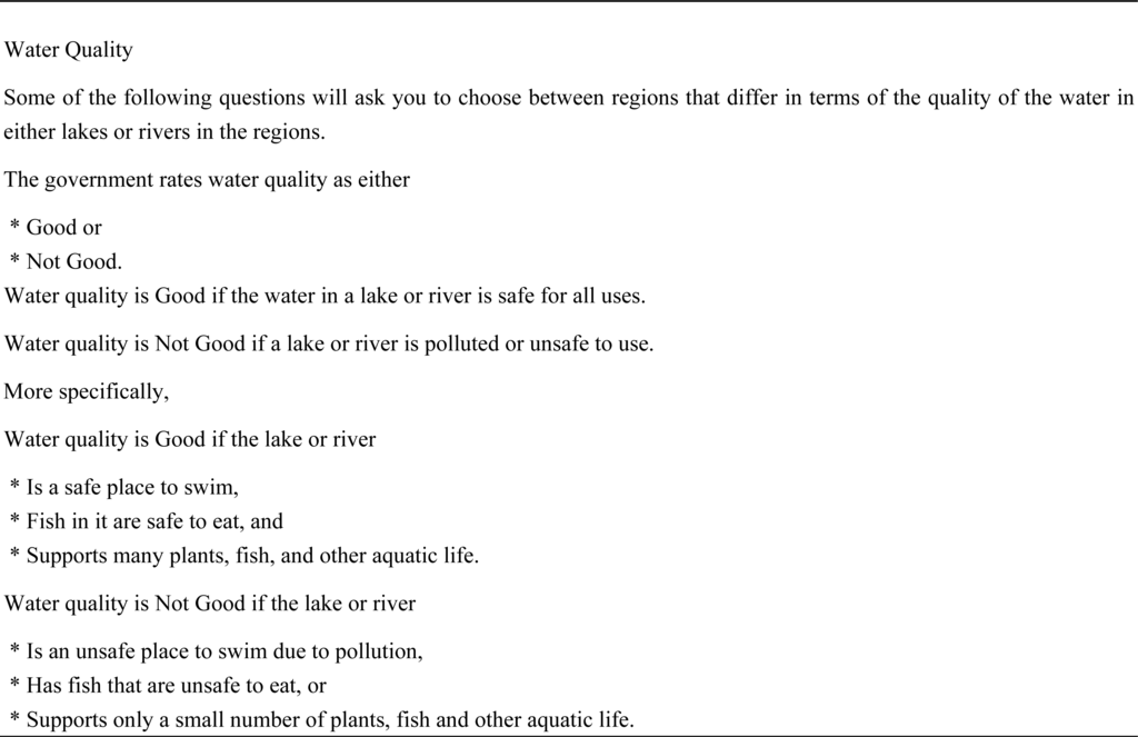 The substantive focus of the survey is the valuation of improvements in inland water quality. In particular, how much do people value increases in the quality of lakes, rivers, and streams? The quality dimensions of interest include the recreational uses of swimming and fishing, and also include ecological benefits to plants, fish, and wildlife that are associated with clean water. People may value many of these benefit components regardless of whether they visit lakes and rivers. While ecological benefits are mostly associated with non-use, we found non-use values for all the water quality features. The estimated values combine use and non-use values of the features. As a consequence, attempts to elicit monetary values of water quality based on recreational visits to lakes and rivers cannot capture all the benefits associated with water quality. To obtain these values, some kind of survey approach that can elicit meaningful measures of water quality is essential. Because the survey structure we have designed involves an interactive computer-based valuation task, the survey mode must be able to both accommodate computer implementation and create a context in which a representative sample of respondents can give thoughtful responses to the valuation task.