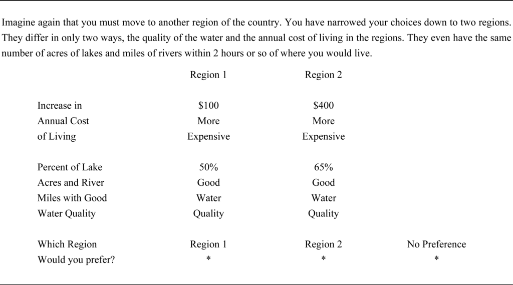 In order to avoid focusing on idiosyncratic aspects of the respondent’s region that could not be monitored and might affect responses in unpredictable ways, the survey asked respondents to think about a hypothetical move to one of two new regions that resembled their own region in terms of number of water bodies and general characteristics. The goal of this multiple-question set is to obtain a meaningful point valuation for each individual respondent for an unfamiliar, non-market good using a few relatively simple choices. The survey approach uses a series of iterative paired comparisons patterned after the approach pioneered by Viscusi, Magat, and Huber [7]. These are pairwise regional choices that differ on two dimensions: water quality and cost of living. For further information regarding the iterative choice method used in the survey instrument, see Magat, Huber, and Viscusi [8].