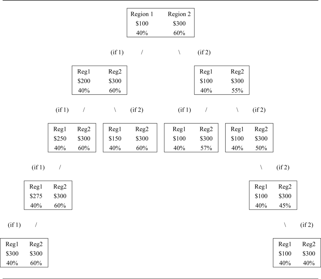 Figure 3 shows a sample iteration tree for the question set. The starting point is a choice in which the respondent must pay a $200 premium for a 20% increase in water that is rated as being of Good quality, or $10 per 1% increase in water quality. Respondents who value water quality at more than this amount consider the succession of choices on the right side of the tree for which the regional cost difference remains unchanged but the difference in water quality rating is reduced. Respondents who indicate a lower valuation of water quality on the initial choice go down the left side of the tree in which the water quality difference remains unchanged and the regional cost difference narrows.