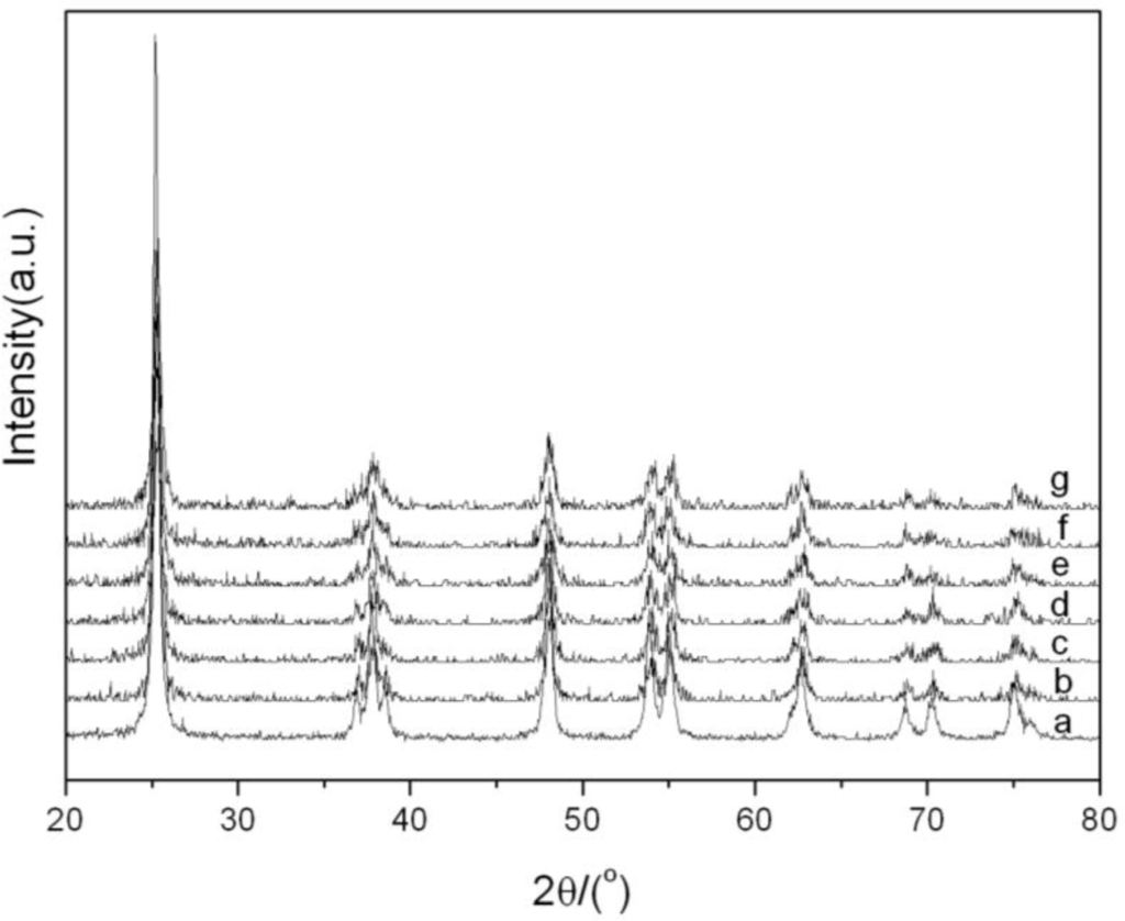 XRD spectra of photocatalysts: (a) TiO2; (b) 0.1%Fe3O4/SiO2/TiO2; (c) 0.25%Fe3O4/SiO2/TiO2; (d) 0.5%Fe3O4/SiO2/TiO2; (e) 1%Fe3O4/SiO2/TiO2; (f) 5%Fe3O4/SiO2/TiO2; (g) 10%Fe3O4/SiO2/TiO2.