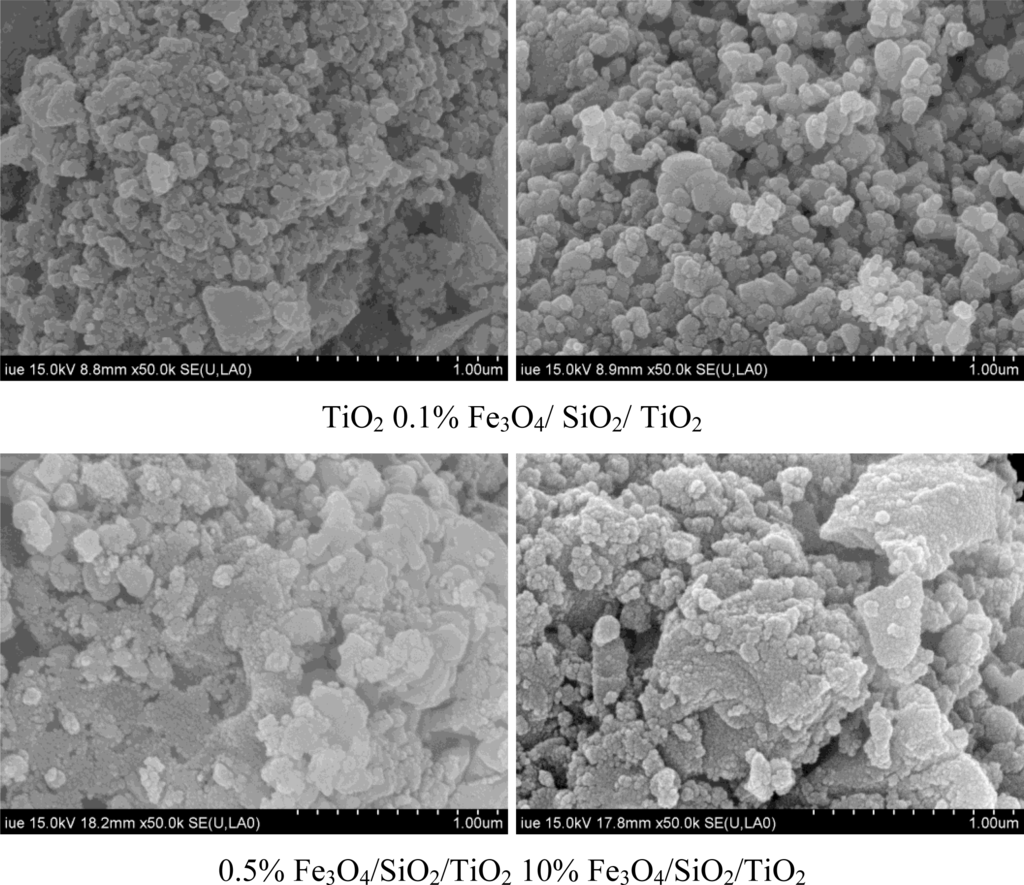 Figure 2 shows the scanning electron microscopy (SEM) images of TiO2 and Fe3O4/SiO2/TiO2 with 0.1%, 0.5%, 10% Fe3O4, respectively. As shown in the figure, the crystal sizes of these four catalysts were all about 1 μm, but agglomeration of catalysts ocurred when Fe3O4/SiO2 was added, and this phenomenon became more apparent as the Fe3O4/SiO2 content increased. The Fe3O4/SiO2 particles play a vital role and are encapsulated by Ti(OH)4 constantly during hydrolysis, so the particle size of the Fe3O4/SiO2/TiO2 catalyst ultimately increases and its dispersion properties weaken. SEM characterization shows that excess Fe3O4/SiO2 in the Fe3O4/SiO2/TiO2 photocatalyst may lead to a sharp decrease of photocatalyst dispersion properties.