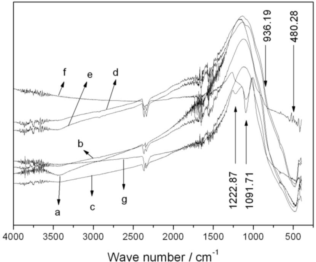 FTIR spectra of photocatalysts: (a) TiO2; (b) 0.1%Fe3O4/SiO2/TiO2; (c) 0.25%Fe3O4/SiO2/TiO2; (d) 0.5%Fe3O4/SiO2/TiO2; (e) 1%Fe3O4/SiO2/TiO2; (f) 5%Fe3O4/SiO2/TiO2; (g) 10%Fe3O4/SiO2/TiO2.