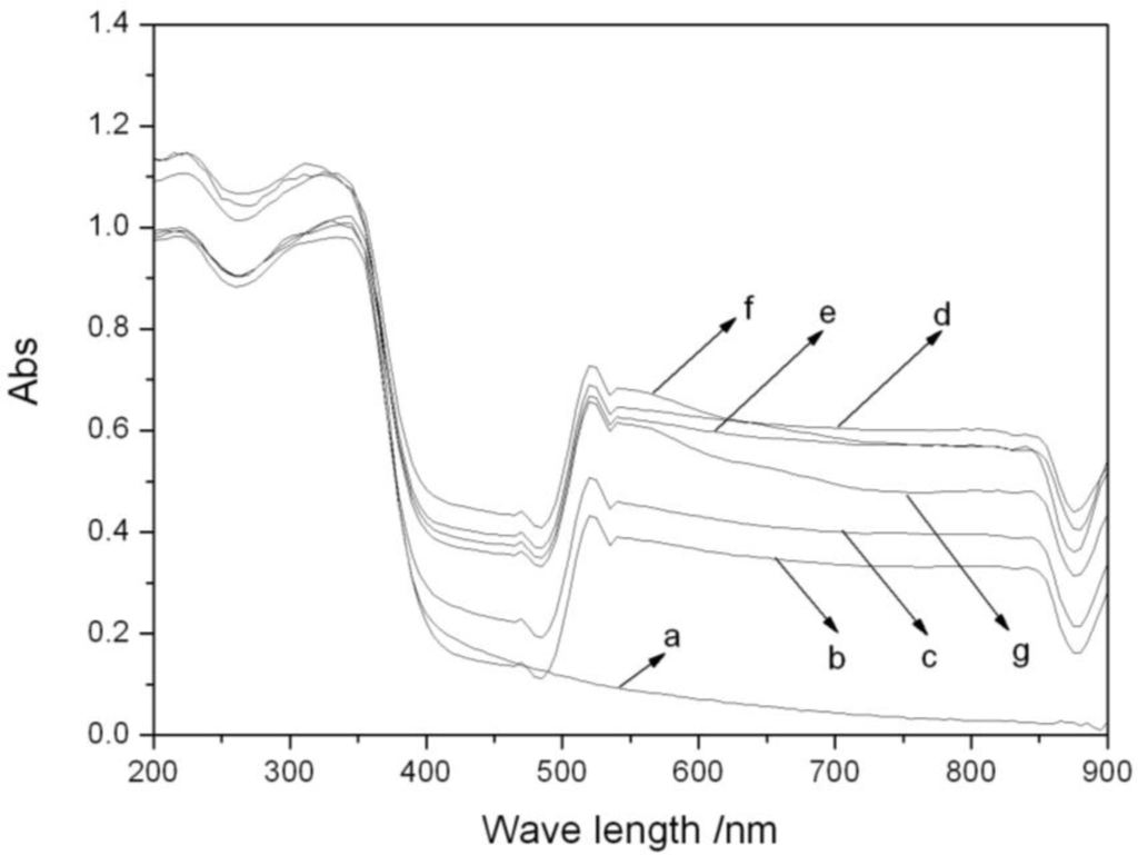 UV-Vis DRS of photocatalysts: (a) TiO2; (b) 0.1%Fe3O4/SiO2/TiO2; (c) 0.25%Fe3O4/SiO2/TiO2; (d) 0.5%Fe3O4/SiO2/TiO2; (e) 1%Fe3O4/SiO2/TiO2; (f) 5%Fe3O4/SiO2/TiO2; (g) 10%Fe3O4/SiO2/TiO2.