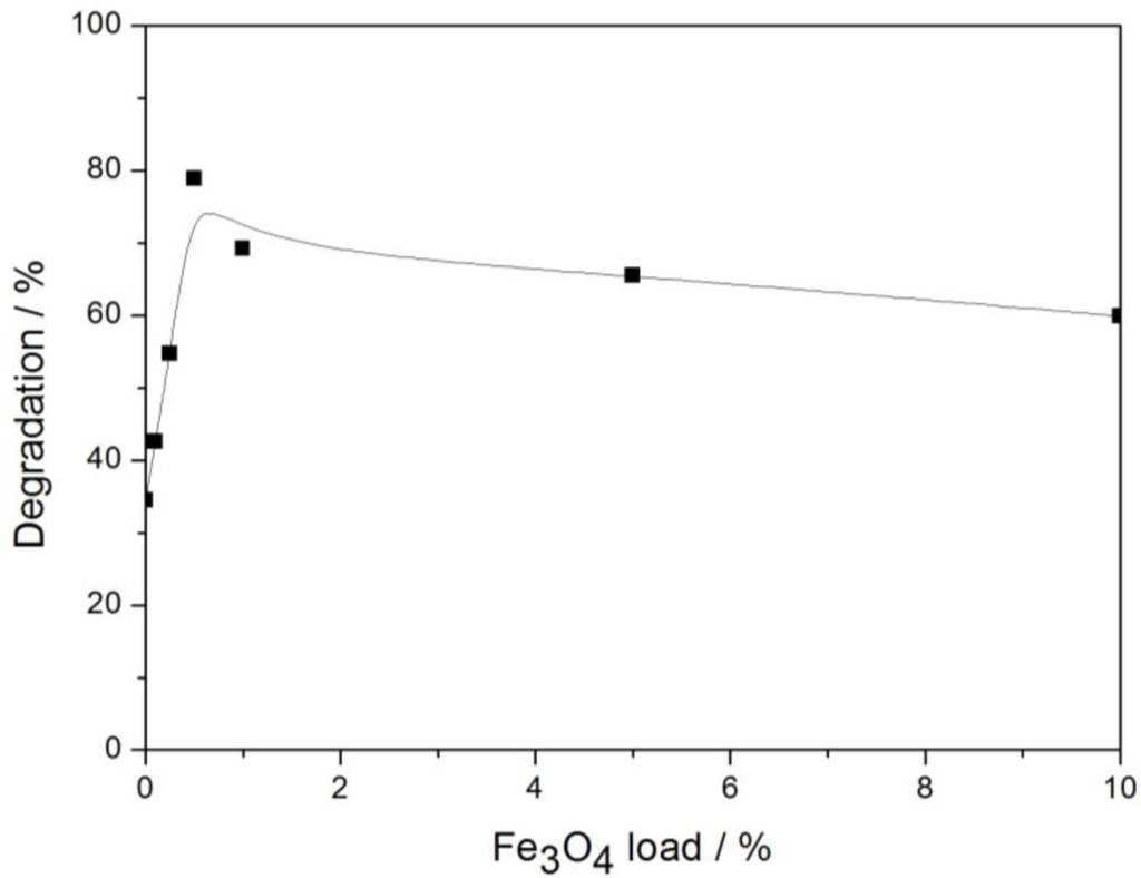 Six samples were prepared with 50 g soil, 0.2 g photocatalysts and 2 mL glyphosate standard stock solution. The photocatalyst in each sample had different Fe3O4 loading. The moisture content of samples was adjusted to 40%. Experimental results after 2 h irradiation (sunlight intensity was 11.88 mW/cm2) are shown in Figure 5. It can be seen that catalysts with Fe3O4 had better activity than TiO2. Fe3O4 greatly enhances the efficiency of visible light absorption, so Fe3O4/SiO2/TiO2 catalysts show excellent photocatalytic activity under sunlight irradiation. Using Fe3O4 as photocatalyst, the degradation of glyphosate was only 53.04%, which was much lower than with 0.5% Fe3O4/SiO2/TiO2 where the degradation was 78.84%. It indicates that Ti-O-Si bond in Fe3O4/SiO2/TiO2 catalyst can reduce the probability of the hole-electron pair recombination, thus improving the photocatalytic activity of the catalyst.