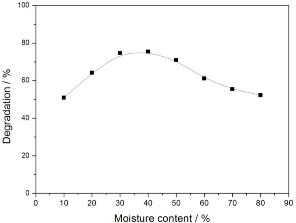 Eight samples were prepared with 50 g soil, 0.2 g 0.5% Fe3O4/SiO2/TiO2 photocatalyst and 2 mL glyphosate standard stock solution. The moisture content was adjusted to a reference value. Experimental results are shown in Figure 6 (sunlight intensity was 11.73 mW/cm2). In view of Figure 6, degradation of glyphosate was not ideal when the moisture content was lower than 30% or higher than 50%. Degradation was basically at a higher level with a moisture content ranging from 30% to 50%. The moisture content of samples affects the glyphosate distribution among the water, soil and air phases in soil. In addition, the moisture content also affects the amount of free radical formation on the catalyst surface. Glyphosate cannot diffuse to the catalyst surface fast when the moisture content is lower than 30%. Only if the glyphosate is adsorbed on the surface of photocatalysts, can it be degraded because the lifetime of free radicals is reportedly very short, and these free radicals are practically produced on surface of photocatalysts. Therefore, a low moisture content hinders the degradation of glyphosate. On the contrary, O2 cannot diffuse to the surface of photocatalysts, when the moisture content is higher than 50%. This effect results in a significant decrease in the production of free radicals, because O2 is one of the most important substances in the free radical generation process. Therefore too much water in soil also leads to a lower removal rate. The most efficient degradation of glyphosate ocurrs when the moisture content is between 30% and 50% for the diffusion of pollutants and O2 balance. The moisture content in subsequent experiments was set at 40%.