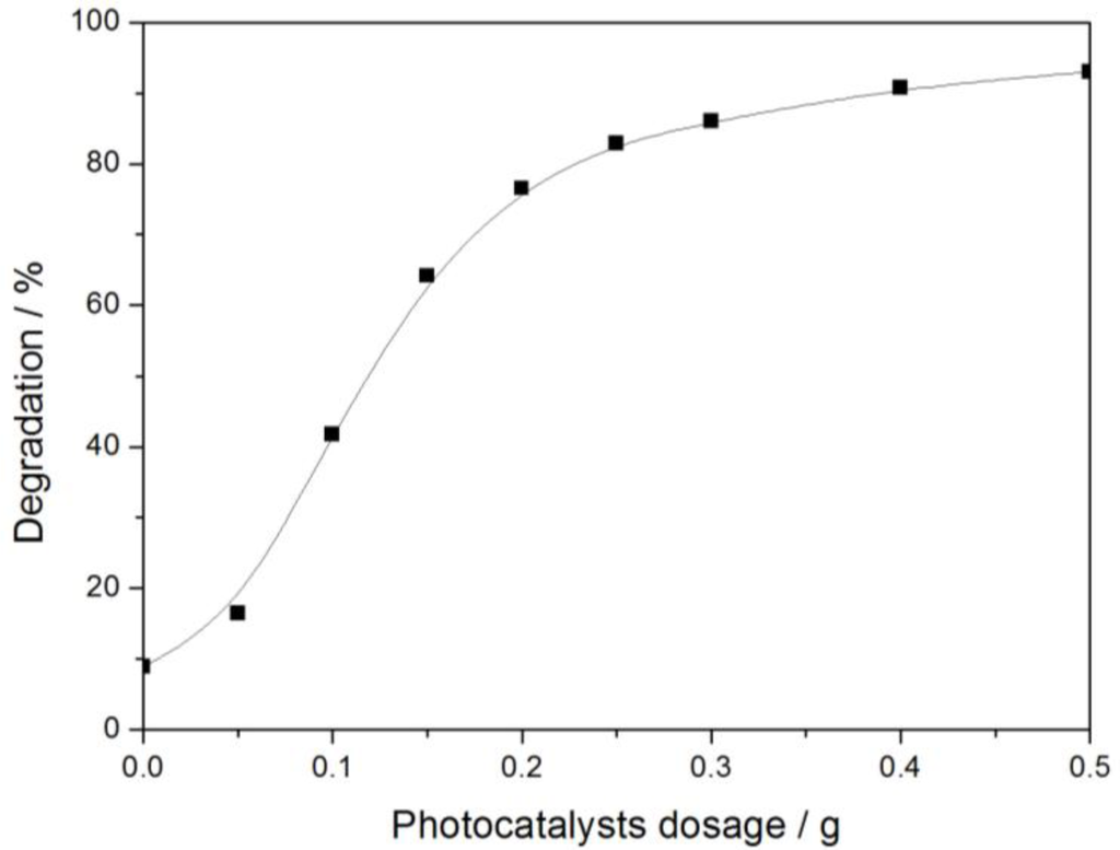 A certain amount of 0.5% Fe3O4/SiO2/TiO2 catalyst and 2 mL glyphosate standard stock solution were separately added to nine samples. The moisture content of all samples was adjusted to 40%. Degradation of glyphosate irradiated 2 h by sunlight is shown in Figure 7 (sunlight intensity was 11.79 mW/cm2). As seen in the figure, it can be concluded that an increase in photocatalyst dosage accelerated the rate of degradation of glyphosate. Degradation was proportional to the photocatalyst dosage when the latter was less than 0.2 g. It increased rapidly. Nevertheless, further photocatalysts led to a slow increase of degradation. There is a maximum value of glyphosate diffusions rate because its concentration in the sample is limited. When this maximum value is reached, excess photocatalyst is useless. Glyphosate concentration is the limiting factor in the reaction under these conditions, so the reaction rate tends to remain constant.