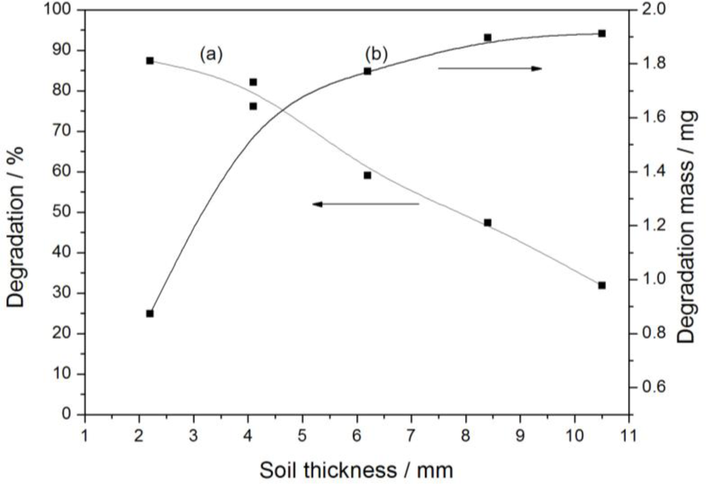However, Figure 8 (b) shows that the total mass degradation of glyphosate in 2 h kept increasing despite the fact the degradation went down. Photocatalysis occurs in all levels of the soil when the soil thickness declines, because sunlight can penetrate all the layers. Under these conditions, increasing the thickness can promote the amount of glyphosate involved in photocatalysis, so the mass degradation increases rapidly. When the soil thickness is beyond sunlight exposure capacity, no more soil and glyphosate are involved in photocatalytic reaction, so glyphosate degradation mass in 2 h tends to a fixed quantity. It is shown in Figure 8 (b) that the maximum degradation amount within 2 h in this system is about 1.9 mg.