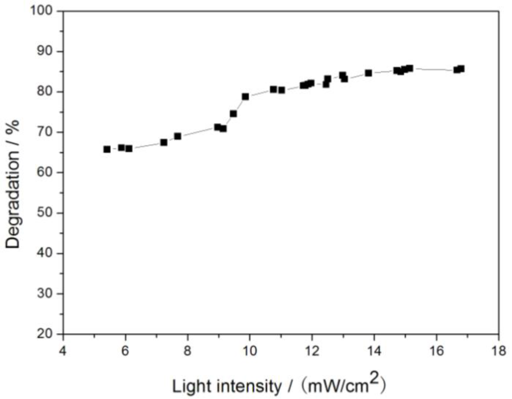 All samples were prepared with 50 g soil, 0.2 g 0.5% Fe3O4/SiO2/TiO2 photocatalyst and 2 mL glyphosate standard stock solution. Moisture content of all samples was adjusted to 40%. These samples were irradiated under different weather conditions. According to the light intensity data, the experimental results shown in Figure 9 suggest that the glyphosate degradation rate increased slowly with sunlight intensity. The removal rate was 67% when the light intensity was about 6 mW/cm2, and it reached 86% when the light intensity was about 16 mW/cm2. Glyphosate was degraded faster when the light intensity exceeded 10 mW/cm2. We tentatively interpret this phenomenon as a consequence of the temperature change of the soil. Generally, when it is cloudy and the temperature is lower when the irradiation intensity is below 10 mW/cm2. Higher sample temperatures are conductive to the photocatalytic degradation.