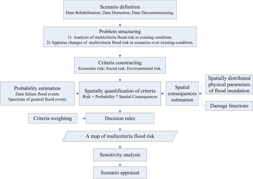 Developing a framework for the analysis of spatial multicriteria flood risk that incorporates economic, social and environmental dimensions is crucial for decision making for dam management, especially in urban areas. Based on spatial multicriteria decision analysis theory, a framework was developed to analyze the changes in the multicriteria flood risk of two management scenarios with regard to risk under existing conditions. This framework included scenario definition, problem structuring, criteria construction, spatial quantification of criteria, criteria weighting, decision rules, sensitivity analyses, and scenario appraisal. It is a conceptual framework that can be applied to other places, and its specific methods and criteria should be adjusted or improved according to the circumstances of each case and the availability of data.