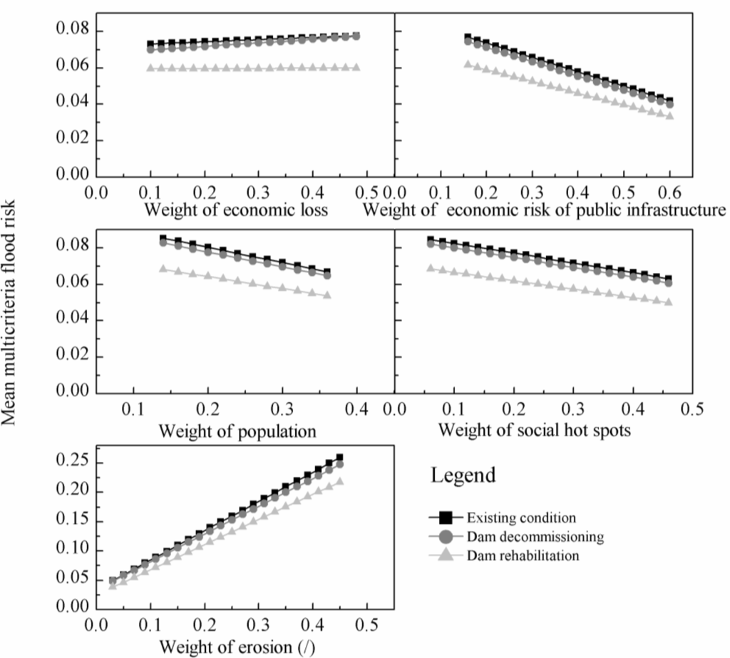 In the case study of the Heiwa dam, the existing-condition analyses following this framework indicated that there would be serious flood inundation even in a 50-year flood event. A high flood risk was found for some of the residential buildings, social hot spots and the Jinghu Railway. The dam-rehabilitation simulation indicated that the multicriteria flood risk was reduced by 0.25 in most of the affected areas and resulted in a reduction of the mean risk. However, this reduction was no more than 23% based on the sensitivity analysis. If the dam were to be decommissioned, an increase in the inundation depth of more than 0.15 m would be found near the dam site where residential and commercial buildings are concentrated. This would cause the multicriteria flood risk to be increased by 0.20 in that location. However, the less intense and less frequent dam-failure flooding that follows dam decommission did not make the mean risk greater than the risk under existing conditions.