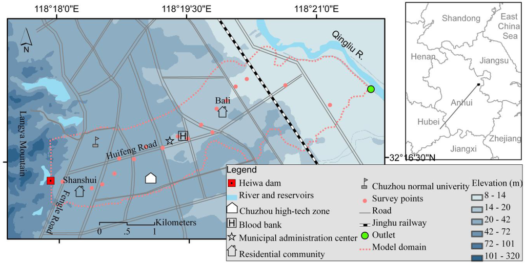 The study area was the southwest region of Chuzhou City, which is situated at 32.3° N, 118.5° E in Anhui Province, China. The area slopes from Langya Mountain in the southwest to the Qingliu River (Figure 2), and changes topographically from mountainous terrain to flat land. It is located in the East Asian monsoon zone and has an annual average temperature of 15.2 °C and an annual average precipitation of 1,034 mm (57% of which occurs between June and August). There was a small channel that drained water from the upper mountain area to the Qingliu River. During the progress of city expansion, the natural channel was mostly encroached upon, thus compounding flooding problems. The Heiwa Dam, located at the foot of Langya Mountain (Figure 2), is an earthen dam built in 1950 for irrigation and mountain flood control. Owing to the poor construction quality and management, the dam has aged and deteriorated over the past 60 years. It is no longer operated for its original purpose because the surrounding farmlands have been largely converted to urban areas. The dam site and its surrounding areas have been allocated to the construction of a new campus of Chuzhou Normal University.