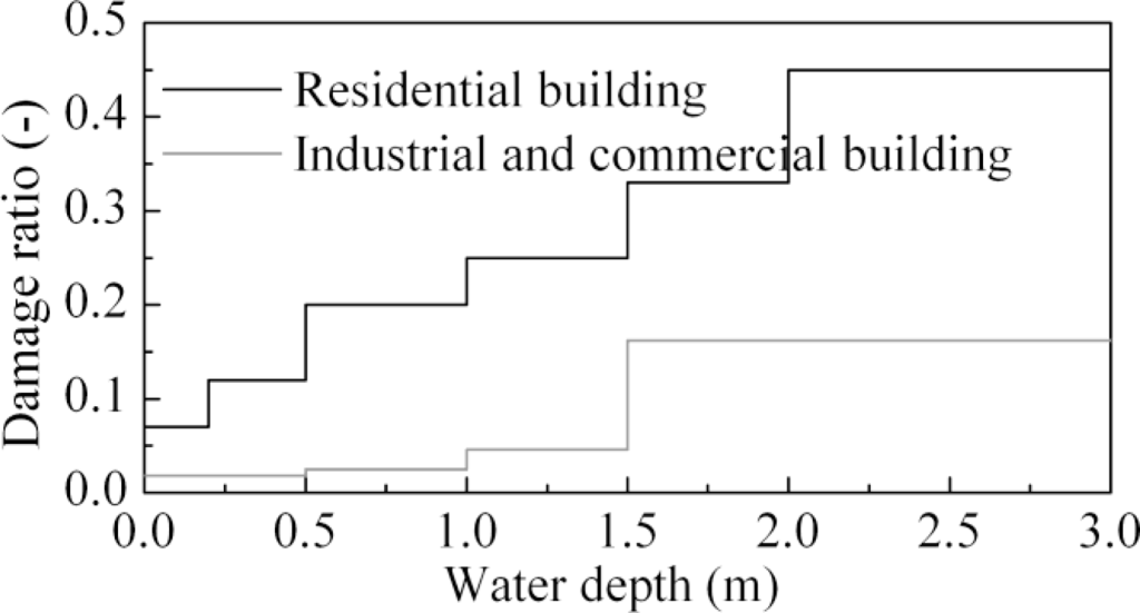 The study area is densely populated. The criteria were constructed according to a similar study [16] and are listed in Table 2. The direct economic loss to assets and inventories of residential, industrial and commercial buildings was used as an indicator of economic loss. The asset values that are at risk were estimated based on official statistics [22]. The value of a unit area was 652 yuan/m2 for residential buildings and 640 yuan/m2 for industrial and commercial buildings. Depth-damage curves were used to calculate the damaged share of these values. The depth-damage curves in this study (Figure 3) were extrapolated from other sites in China [23,24] and attention was paid to the similarity in building type and contents during the extrapolation [25].