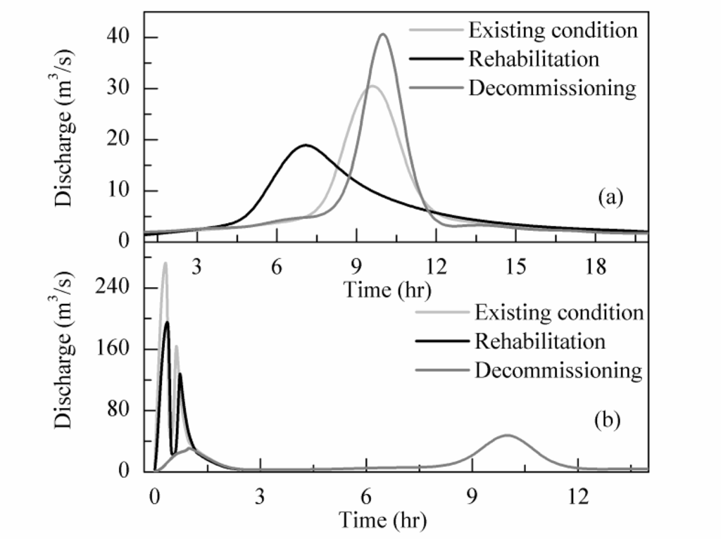 Through decreasing the dam height to 4 m, this scenario is expected to significantly decrease the probability of dam failure. There will however be no storage capacity for future flood control if this scenario is adopted, so there is concern that the flood risk may increase under this scenario. The second scenario is dam rehabilitation, which refers to repairing the dam and its associated structures to achieve an acceptable level of safety. In addition, through decreasing the normal operating depth by 1.2 m, part of the storage capacity would be adjusted for flood control. As a result, the storage capacity for flood control would be increased by 45%.