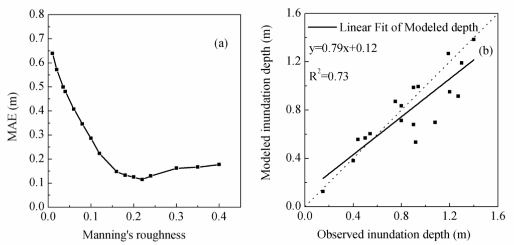 (a) MAE of different values of Manning’s roughness from 0.01 to 0.4; (b) comparison of the observed and modeled inundation depth using Manning’s roughness of 0.22.