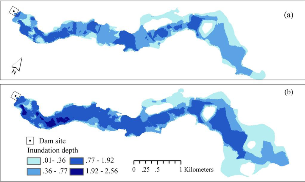 Modeled maps of inundation depths in (a) 50-year floods and (b) dam-failure floods under existing conditions.