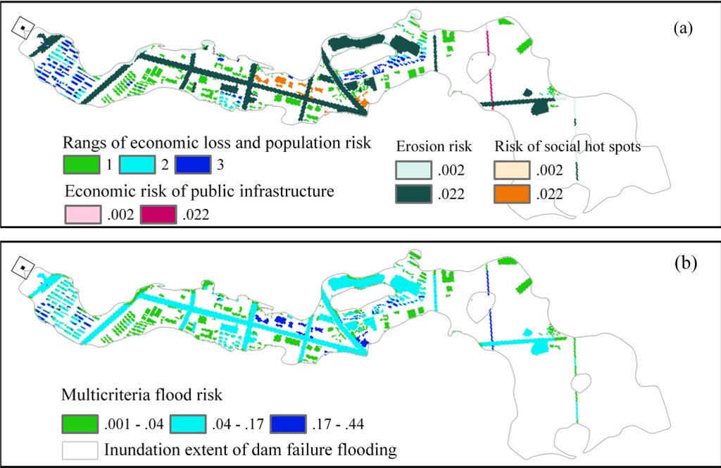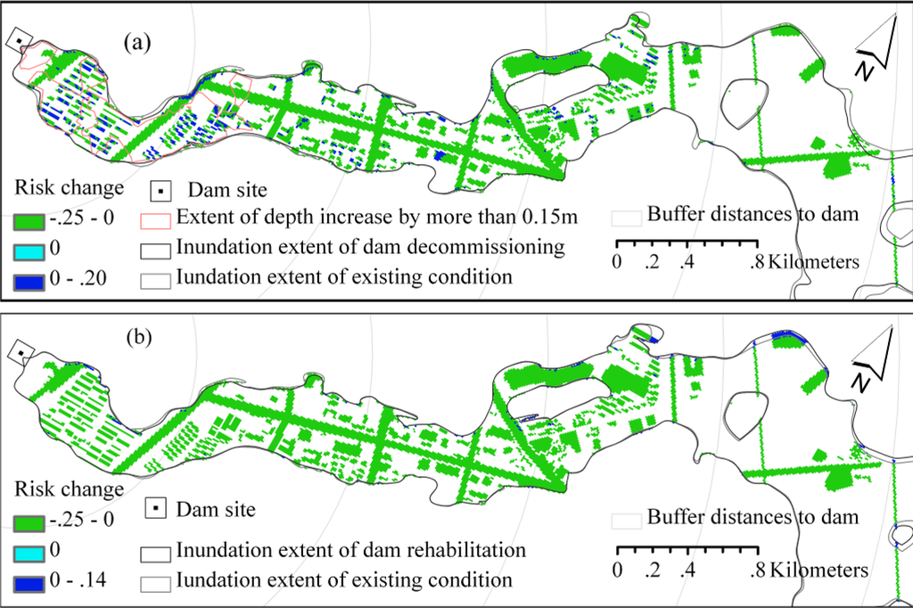 Changes of multicriteria flood risk from risk under existing conditions in two scenarios: (a) dam decommissioning scenario and (b) dam rehabilitation scenario.