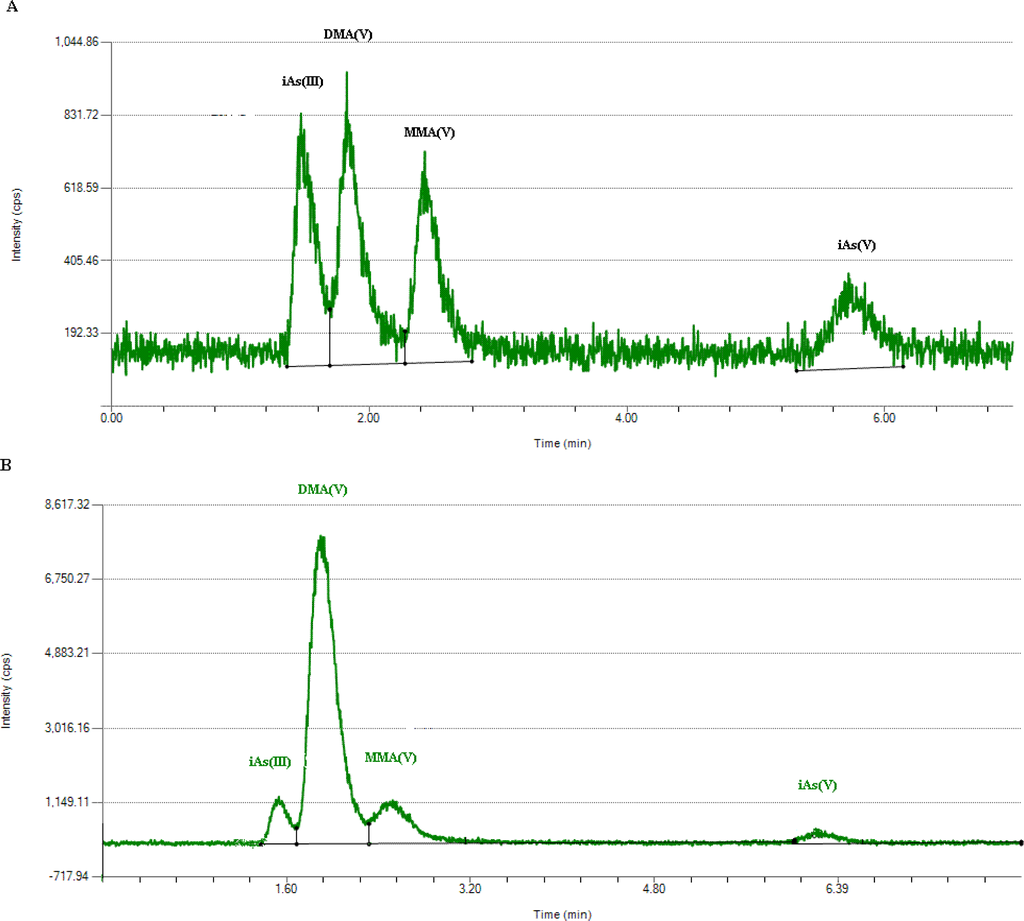Briefly, 1-mL urine was passed through a filter with 0.22 μm pore size and 13 mm diameter. Then, each sample was determined by HPLC in triplicate. A typical chromatogram of four arsenic species in standard mixture in deionized water was shown in Figure 2(A) and in a urine sample in Figure 2(B). The retention times of iAsIII, iAsV, MMAV and DMAV were 1.5, 1.8, 2.4 and 5.7 min, respectively.