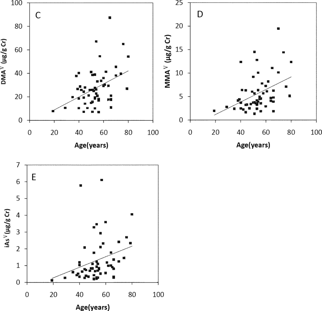 Correlation of age with (A) TAs (R = 0.411, p = 0.001); (B) iAsIII (R = 0.343, p = 0.009); (C) iAsV (R = 0.422, p = 0.001); (D) MMAV (R = 0.439, p = 0.001); (E) DMAV (R = 0.353, p = 0.007) in the urine.