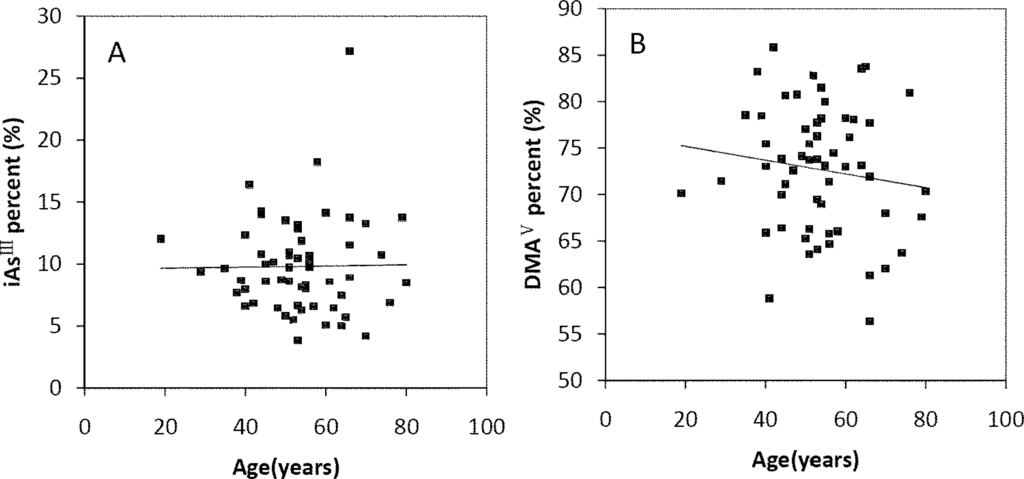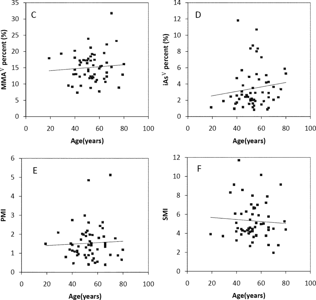 The Spearman’s correlation coefficients of Age/TAs (0.411), Age/iAsIII (0.343), Age/DMAV (0.353), Age/MMAV (0.439) and Age/iAsV (0.422) were shown in Figure 3A–E. The figures shown that age was positive correlated with the concentrations of TAs, iAsIII, DMAV, MMAV and iAsV. These suggested that more arsenic may have been accumulated in the elder than in the younger. As regards arsenic methylation capability, the iAsIII percent, iAsV percent, MMAV percent, DMAV percent, PMI and SMI did not reach statistical significance with age. (Figure 4). These suggested that the arsenic methylation capability may not correlated with age.